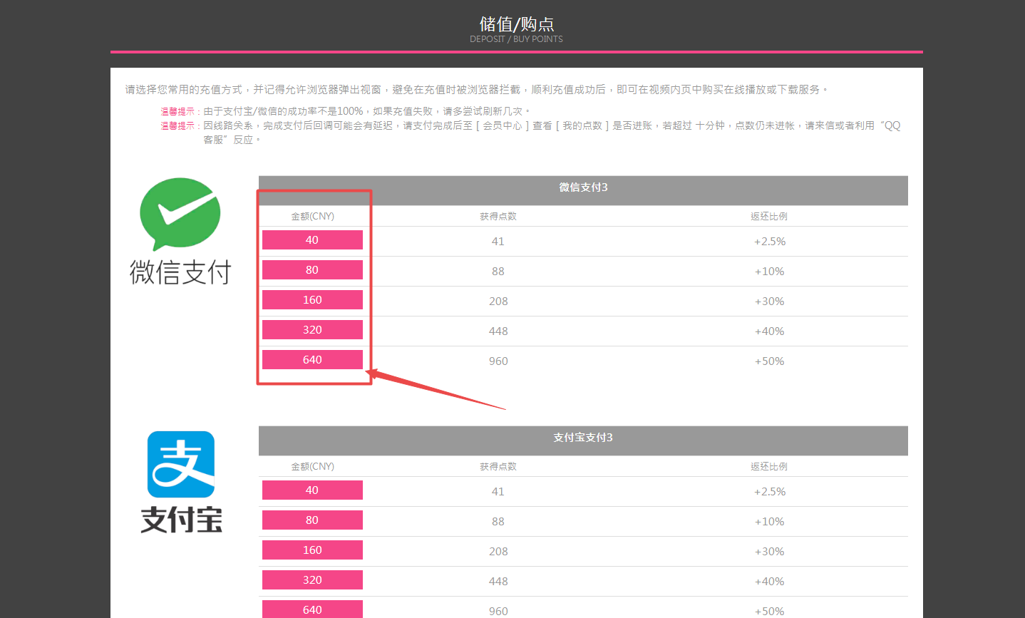 2. 付费馆影片 : 请到会员中心 or 影片扣点 这两个页面都可看到付费频道扣点介绍,您可依自己的实际需要去选择影片方案。